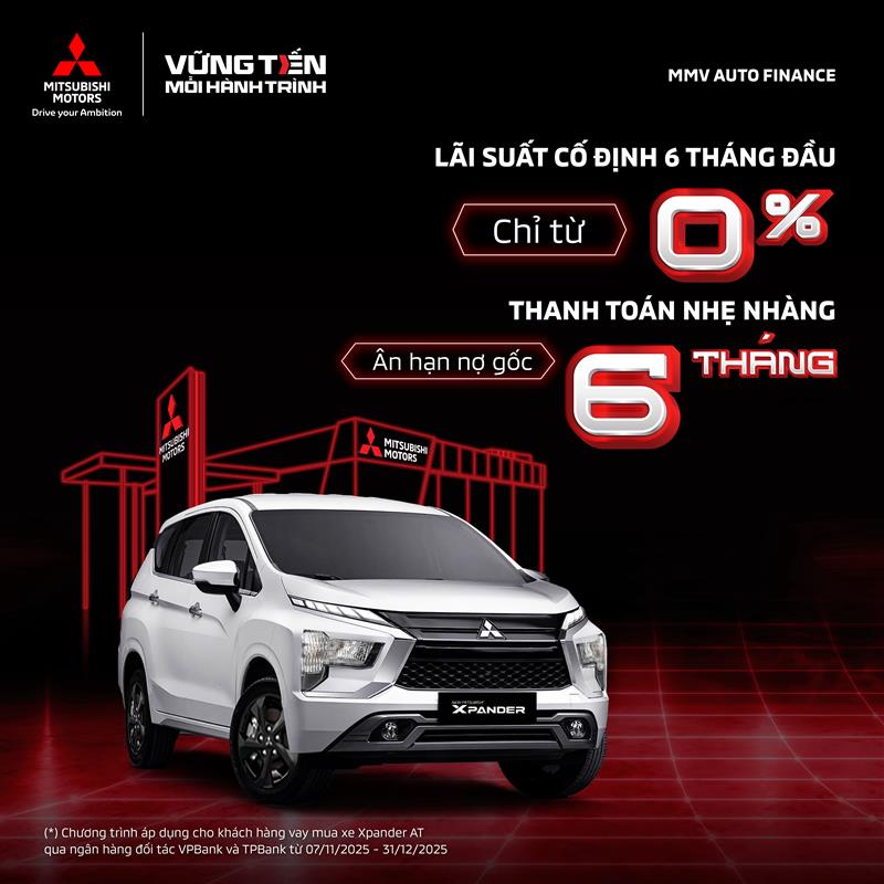 Mitsubishi Motors Việt Nam phối hợp cùng hai ngân hàng VPBank và TPBank mang đến chương trình hỗ trợ tài chính đặc biệt dành cho khách hàng mua xe Xpander phiên bản AT, với ưu đãi lãi suất hấp dẫn 0% trong thời gian đầu.